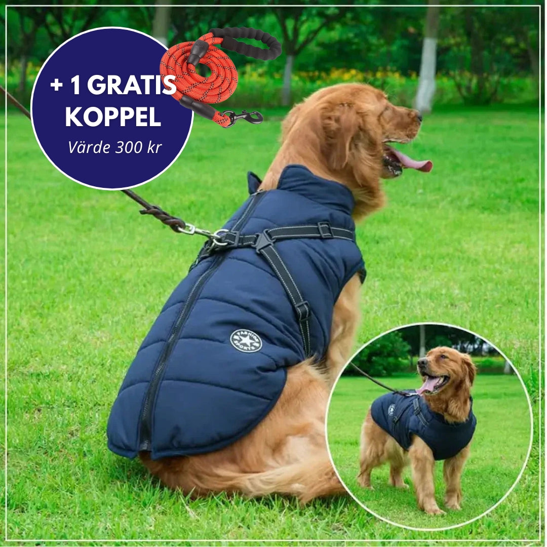 Vår vattentäta och slitstarka hundjacka skyddar din hunds känsliga områden mot kyla, fukt och vind.